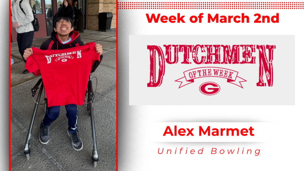 Congratulations to Alex Marmet (Unified Bowling) and the Indoor Track 4 x 400 Relay Team of Lauren Hickey, Addison Vellekoop, Lauren Burnash and Parker Steele for earning DOW (Dutchmen of the Week) honors for the week of March 2nd.