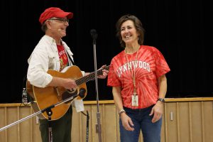 Retiring second-grade teacher Chris White made a surprise appearance on stage after Grammer invited her to join him during the performance. White, who will retire in June after 35 years at Lynnwood, was met with smiles from students and staff who associate Grammer’s music with the school’s long-standing traditions.