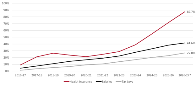 The graph shows how increases in contractually-obligated health insurance and salary costs far outpace increases in the tax levy.